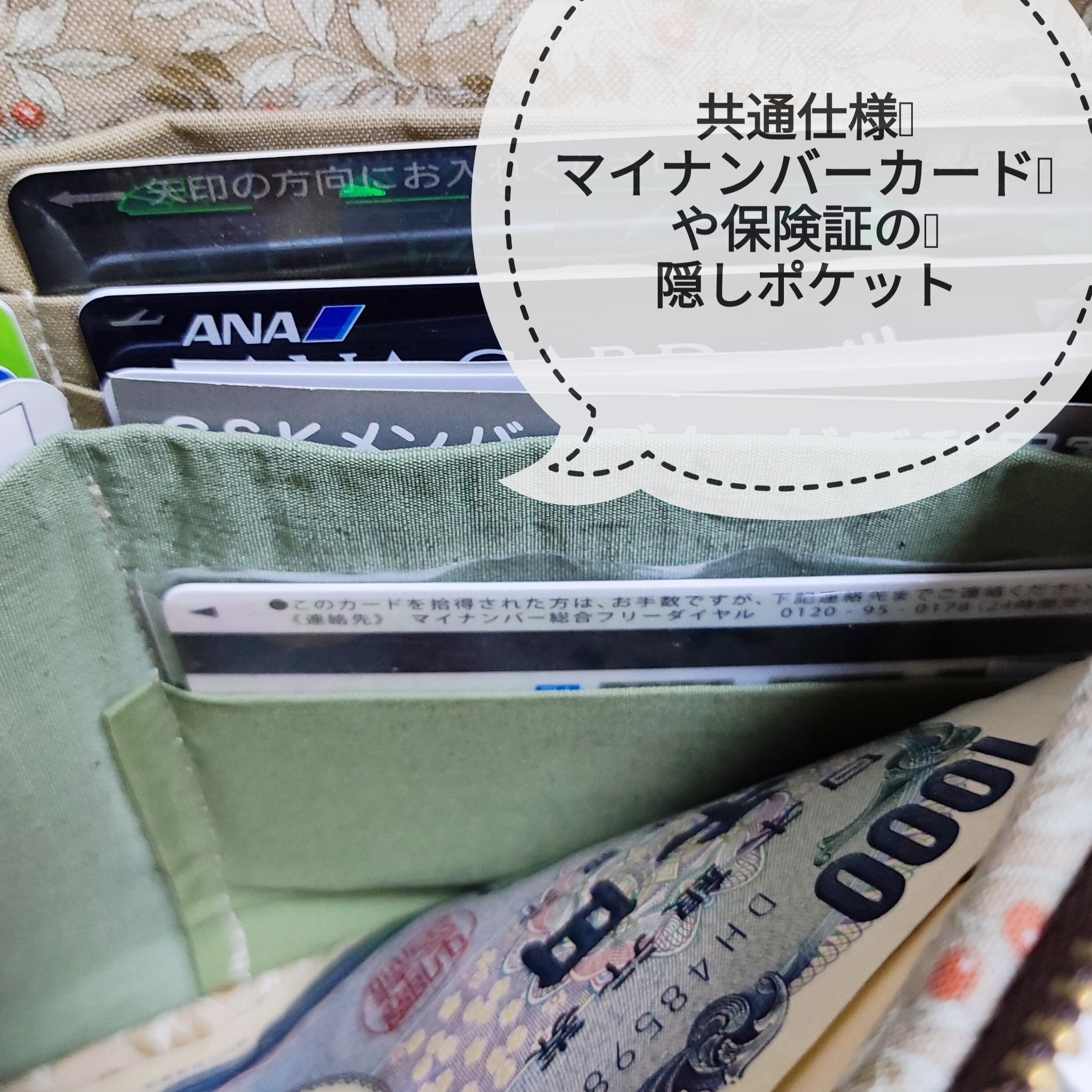②隠しポケットにはマイナンバーカードをしっかり収納。